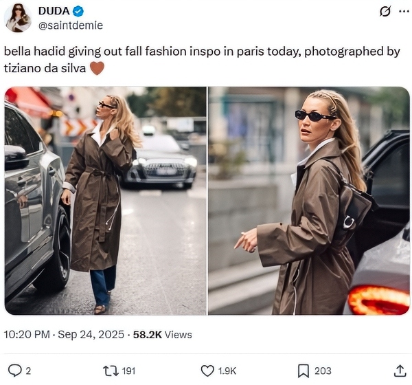 On X, photos showed that Bella Hadid wore a brown trench coat with straight-leg jeans. That might sound boring, but nothing Bella ever wears can be described as that. In fact, she looked chic and ready to roll.