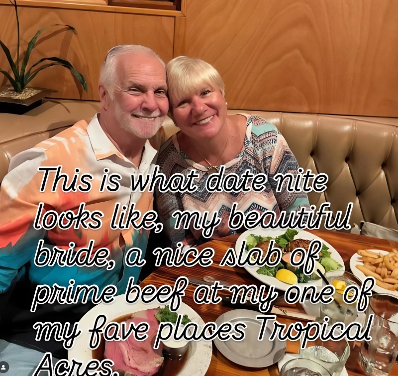 In the text overlay, it said, “This is what date nite looks like, my beautiful bride, a nice slab of prime beef at my one of my fave places Tropical Acres.”
